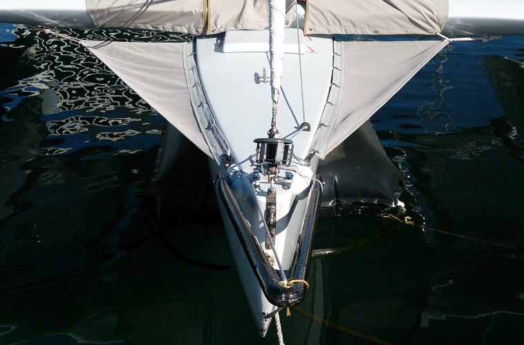 This trimaran sails out of Marina Del Rey. Structural spacers were used so that the Sprit could be placed forward enough to offer the best extension of the tack from the bow.